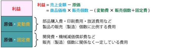 損益分岐点は、前述したように限界利益と固定費が同じ金額となる売上高であり、言い換えれば、利益がゼロになる売上高のことです。売上高、変動費、固定費と利益の関係は次のようになっています。